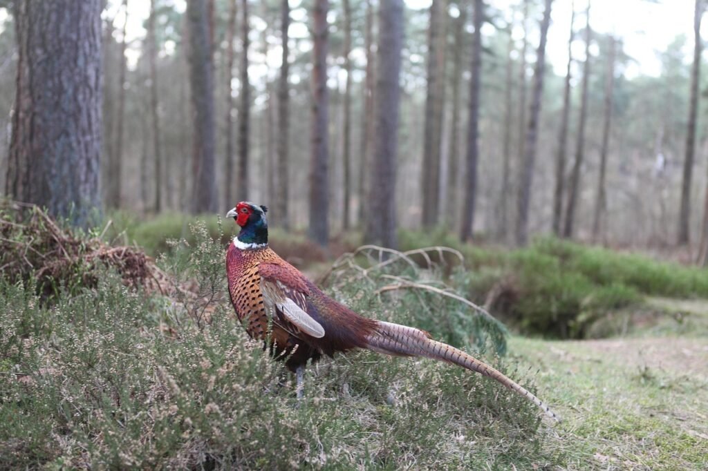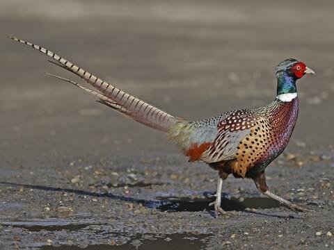 In their natural habitat, look for Ring-necked pheasants on agricultural land and old fields—especially fields that are interspersed with grass ditches, hedges, marshes, woodland borders, and brushy groves. They can live in forests, grasslands, and deserts. Despite this versatility, Ring-necked Pheasants do gravitate to particular kinds of habitat for specific activities. Typically, they roost in trees or dense shrubs in spring and summer and in forested wetlands, farm fields and weedy areas in fall. For early season nesting, they seek cover along grassy roadsides, fence lines, ditches, and wetlands. As the season progresses and vegetation grows taller and denser, they shift their nesting activity to fields of hay, particularly alfalfa. Ringed-necked Pheasants eat seeds—especially grain from farm fields—as well as grasses, leaves, roots, wild fruits and nuts, and insects. Their spring and summer diet is similar, but with a greater emphasis on animal prey and fresh greenery. They eat insects such as grasshoppers, beetles, caterpillars, crickets, and ants, as well as snails and earthworms. Ring-necked Pheasants forage in grasslands, hayfields, woodland edges, and brushy areas. They sometimes pick waste grain from cow manure in pastures. Pheasants take most of their food from the ground, scratching or digging with their bills. They can retrieve roots or seeds from as deep as three inches below the soil surface. They also sometimes forage in shrubs or trees for fruit, leaves, and buds.