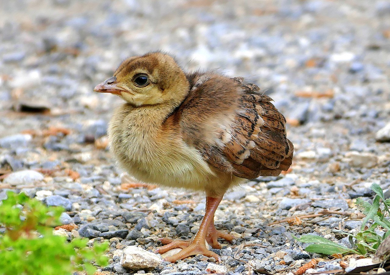 Male green peafowls (Pavo muticus) have green and bronze or gold plumage, and black wings with a sheen of blue. Unlike Indian peafowl, the green peahen is similar to the male, but has shorter upper tail coverts, a more coppery neck, and overall less iridescence. Both males and females have spurs. Chicks of both sexes in all the species are cryptically colored. They vary between yellow and tawny, usually with patches of darker brown or light tan and “dirty white” ivory. In addition to the wild-type “blue” coloration, several hundred variations in color and pattern are recognized as separate morphs of the Indian Blue among peafowl breeders. Pattern variations include solid-wing/black shoulder (the black and brown stripes on the wing are instead one solid color), pied, white-eye (the ocelli in a male’s eye feathers have white spots instead of black), and silver pied (a mostly white bird with small patches of color). Color variations include white, purple, Buford bronze, opal, midnight, charcoal, jade, and taupe, as well as the sex-linked colors purple, cameo, peach, and Sonja’s Violeta. Additional color and pattern variations are first approved by the United Peafowl Association to become officially recognized as a morph among breeders. Alternately-colored peafowl are born differently colored than wild-type peafowl, and though each color is recognizable at hatch, their peachick plumage does not necessarily match their adult plumage.