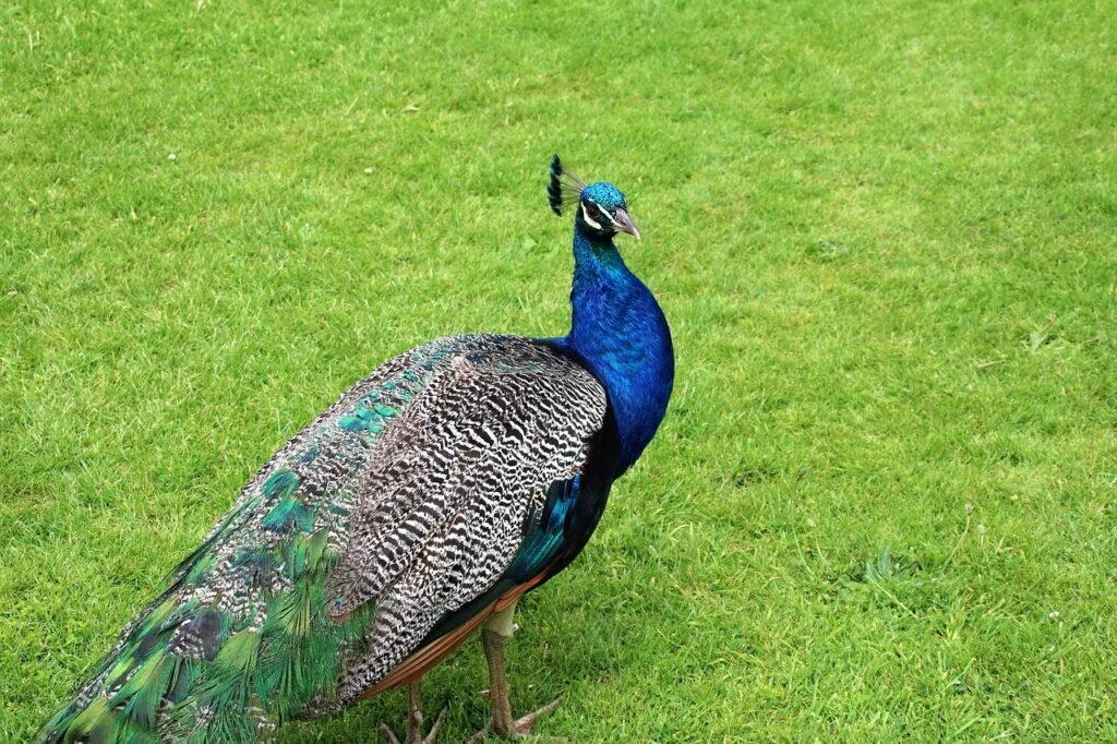 Peafowl are forest birds that nest on the ground, but roost in trees. They are terrestrial feeders. All species of peafowl are believed to be polygamous. In common with other members of the Galliformes, the males possess metatarsal spurs or “thorns” on their legs used during intraspecific territorial fights with some other members of their kind. In courtship, vocalisation stands to be a primary way for peacocks to attract peahens. Some studies suggest that the intricacy of the “song” produced by displaying peacocks proved to be impressive to peafowl. Singing in peacocks usually occurs just before, just after, or sometimes during copulation.